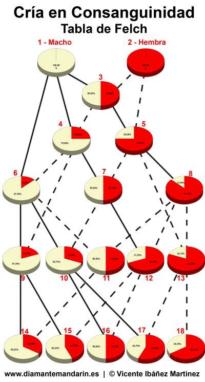 De un macho 1 y una hembra 2, se obtienen canarios 3(50%/50%), de ellos se seleccionara un macho para cruzarlo con la madre, y hembras para el padre, de allí obtendremos canarios con un 75% de uno y el 25% del otro. A estos canarios 4-5 se los cruza con 1, 2 y 3 obteniendo 6, 7 y 8. Observese que volvemos a tener canarios 50%/50% ( 7 ), a estos canarios volveremos siempre para evitar el dominio de una sangre sobre la otra. A los canarios 6, 7 y 8 se los cruza con 1, 2, 4 y 5, obteniendose 9, 10, 11, 12 y 13; donde 11 vuelve a tener 50%/50%. A estos últimos se los junta con 4, 5, 6, 7 y 8 llegando a 14, 15, 16, 17 y 18; los 16 tienen 50%/50%.